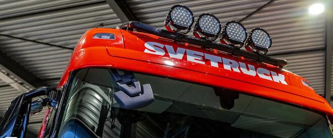 在大件包頂部,車(chē)輛也安裝了高亮LED燈,并附加了兩個(gè)沃爾沃原車(chē)尾燈,增強(qiáng)可見(jiàn)度和安全性。在條形LED燈的上方,SVETRUCK字樣被鏤空,視覺(jué)效果極佳。