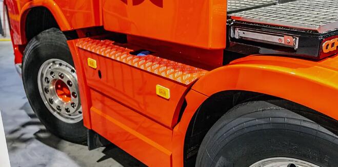 車(chē)輛四根后軸的擋泥板之間也安裝了小尺寸的儲(chǔ)物箱,覆以花紋鋼板并安裝了側(cè)面提示燈。