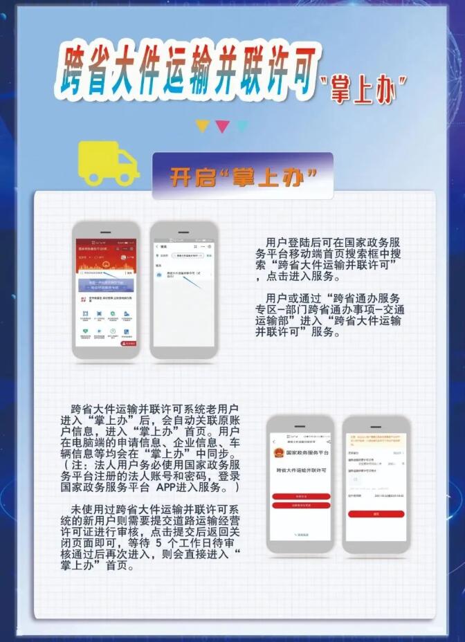 作為2022年交通運輸更貼近民生實事之一的跨省大件運輸許可“掌上辦”,已于11月正式在國家政務(wù)服務(wù)平臺上架應(yīng)用,實現(xiàn)了跨省聯(lián)辦由“網(wǎng)上辦”轉(zhuǎn)為“掌上辦”的重要升級。