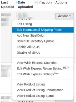若要為促銷產(chǎn)品手動編輯“國際運費”,請在產(chǎn)品頁面點擊“措施> 編輯國際運費”。