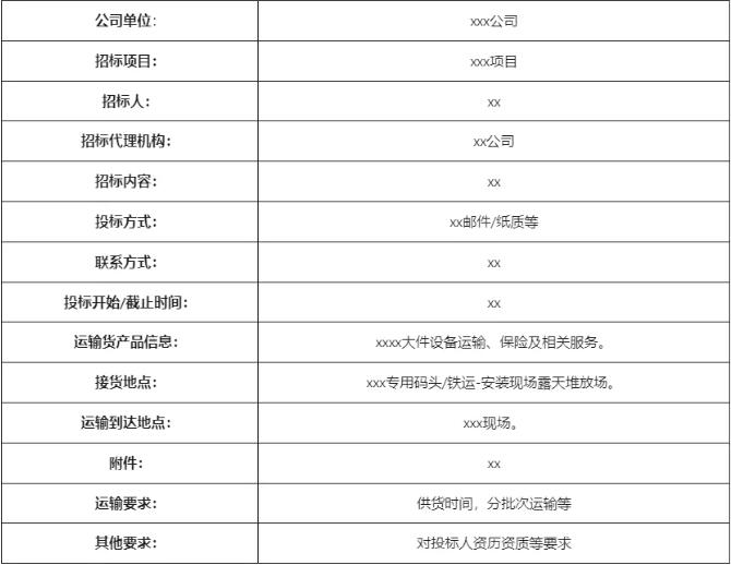 廣告和邀請函的內(nèi)容大體相同,主要包括:運輸方的單位名稱、地址;發(fā)運物件名稱;招標的有關(guān)信息(招標文件號或名稱,所運物件的參數(shù)說明,運輸?shù)奶厥庖?,運輸?shù)钠鹗嫉睾湍康牡兀\輸時間);招標文件的價格、以及開始出售招標文件的時間;報送投標書時間、地點,及投標截止期限;投標保證金金額;對投標人的資格要求。